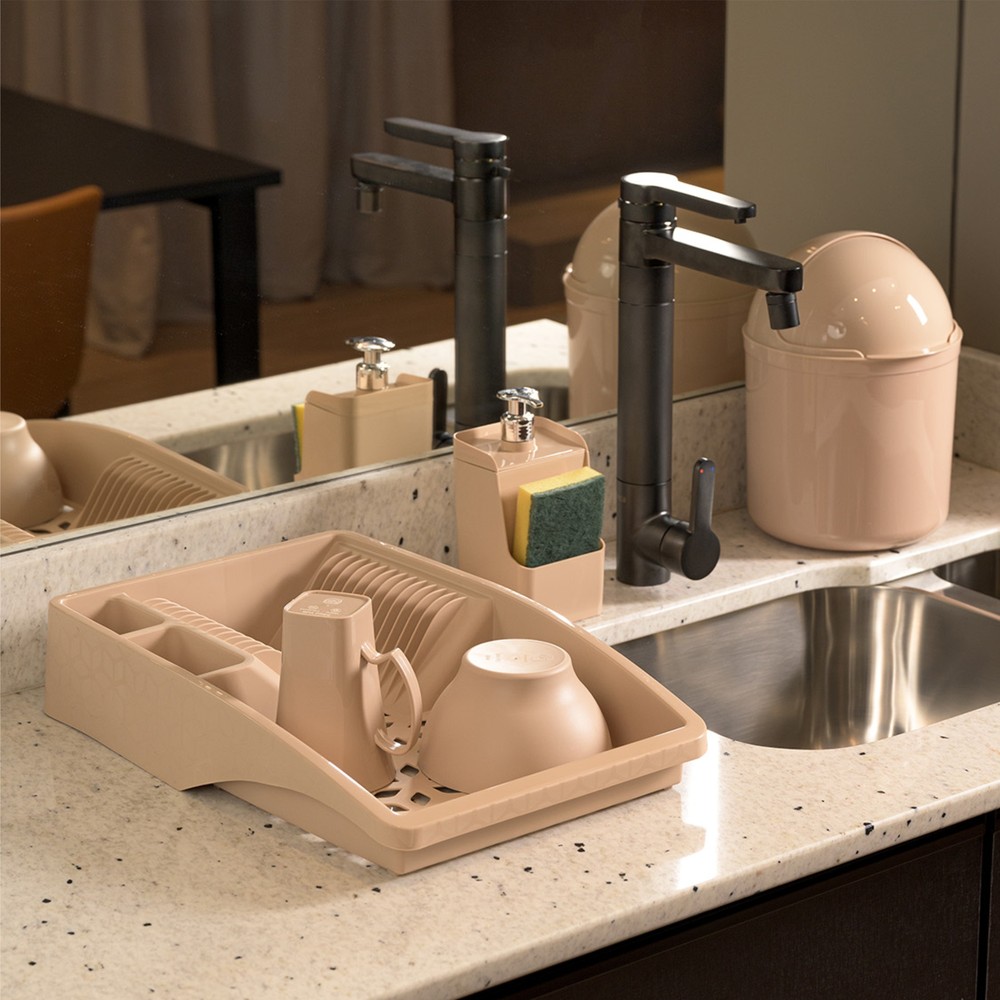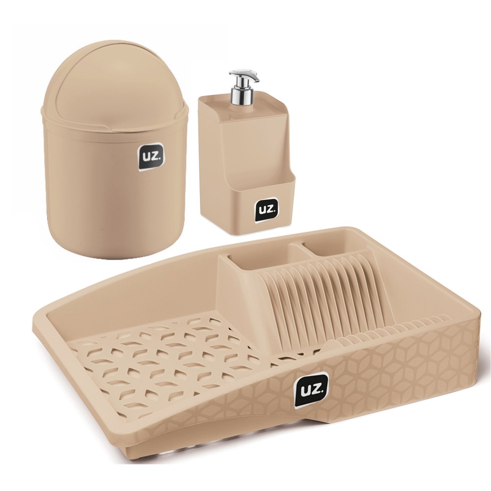 Sua pia mais bonita e funcional com o Kit Pia Multiuso UZ1984 da UZ Utilidades. O kit completo para quem não abre mão de beleza e qualidade, inclusive sobre a pia. Com os produtos ideais para o seu dia a dia, é também uma ótima opção para presentear. São três peças, entre escorredor de louça, lixeira de pia 4l e um dispenser slim, ideal para quem gosta de praticidade em cada tarefa. Produzido em polipropileno (PP) na cor cappuccino, o kit conta com acabamento brilho, além de um design único. O escorredor de louça é espaçoso e conta com ótimas divisões, além de ser vazado, permitindo que a água escorra e uma secagem mais uniforme das louças. Já o dispenser, com válvula pump prata, conta com um design único e moderno, e a lixeira, indispensável para o descarte correto dos resíduos, ajuda a manter tudo limpo. Para todos os momentos do seu dia e para uma cozinha mais completa, aposte no kit pia. Fácil de lavar e secar, para mais durabilidade, durante a limpeza, evite produtos abrasivos que possam danificar o produto.