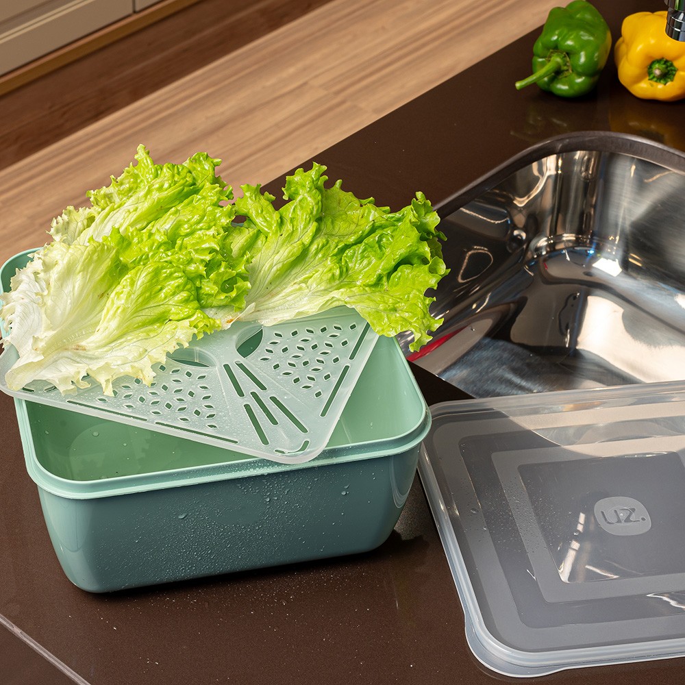 Quando o assunto é preparar uma salada deliciosa, a gente sabe a importância de uma boa limpeza. Por isso, conte com o Escorredor Multiuso 5l UZ406 da UZ Utilidades. Com um design inovador e inteligente, o escorredor é perfeito para o processo de lavagem de frutas, verduras, legumes e folhosos. Podendo ser utilizado desde a geladeira até o freezer ou microondas. BPA Free, ele garante o máximo de segurança na hora de armazenar alimentos, além de ser todo produzido em polipropileno (PP), material resistente e de alta durabilidade, esse será seu maior aliado na hora de preparar aquela salada deliciosa e servi-la à mesa. Com formato quadrado, a tampa é transparente, enquanto o pote é na cor verde menta, e a grade interna permitirá que a água dos alimentos escorra, deixando-os perfeitos para o consumo. Com ótima vedação, ele é fácil de lavar e secar, e para mais durabilidade, durante a limpeza, evite produtos abrasivos que possam danificar o produto. * não utilizá-lo no microondas, retire a tampa.