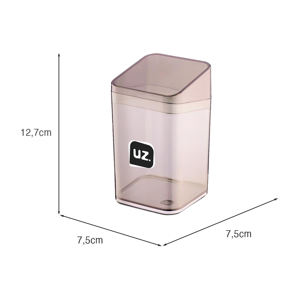 Produzido em Poliestireno (PS) cristal com pigmentos de coloração translúcida, possui design compacto, moderno e inovador, ideal para espaços menores sem abrir mão da elegância. Sua tampa conta com belíssimo acabamento metalizado, é prática e fácil de abrir, facilitando o uso no dia a dia.